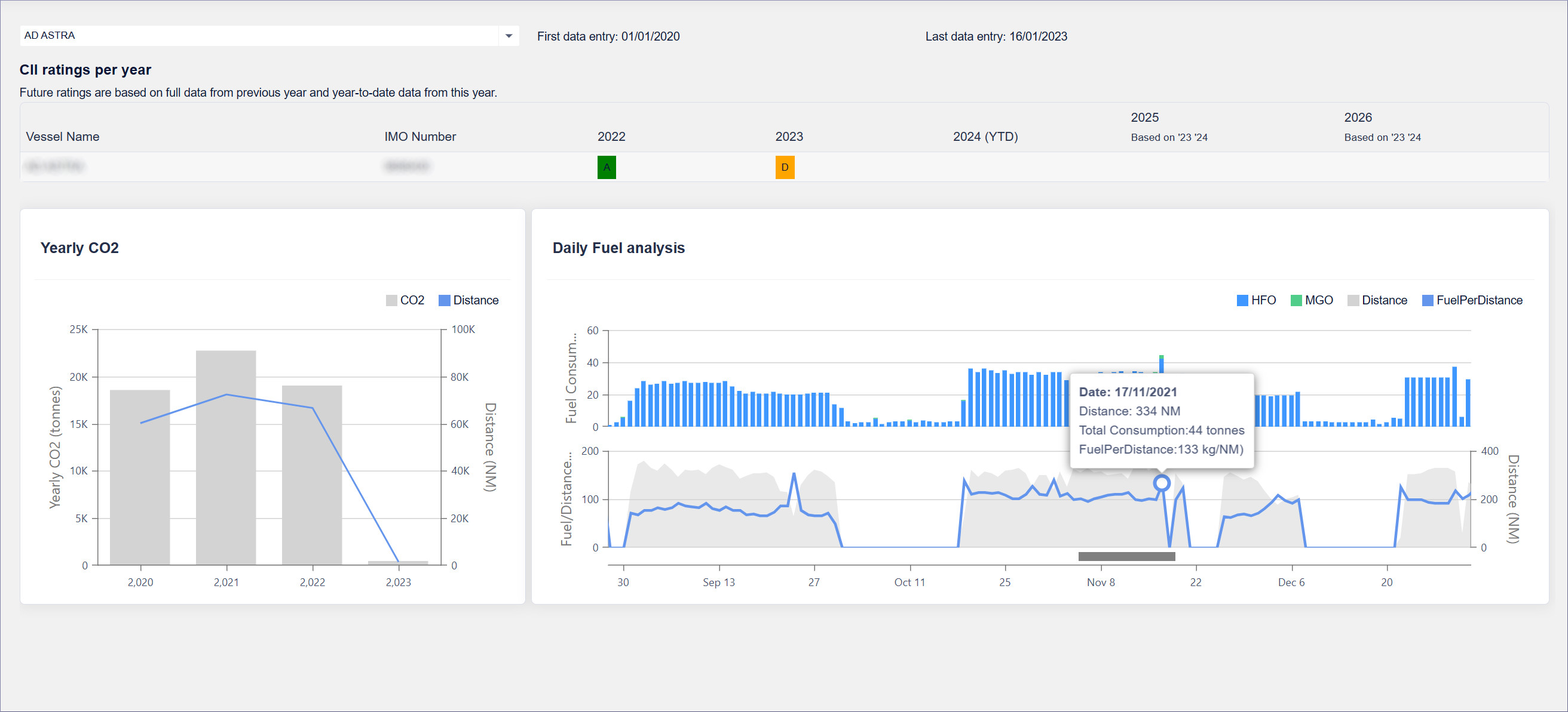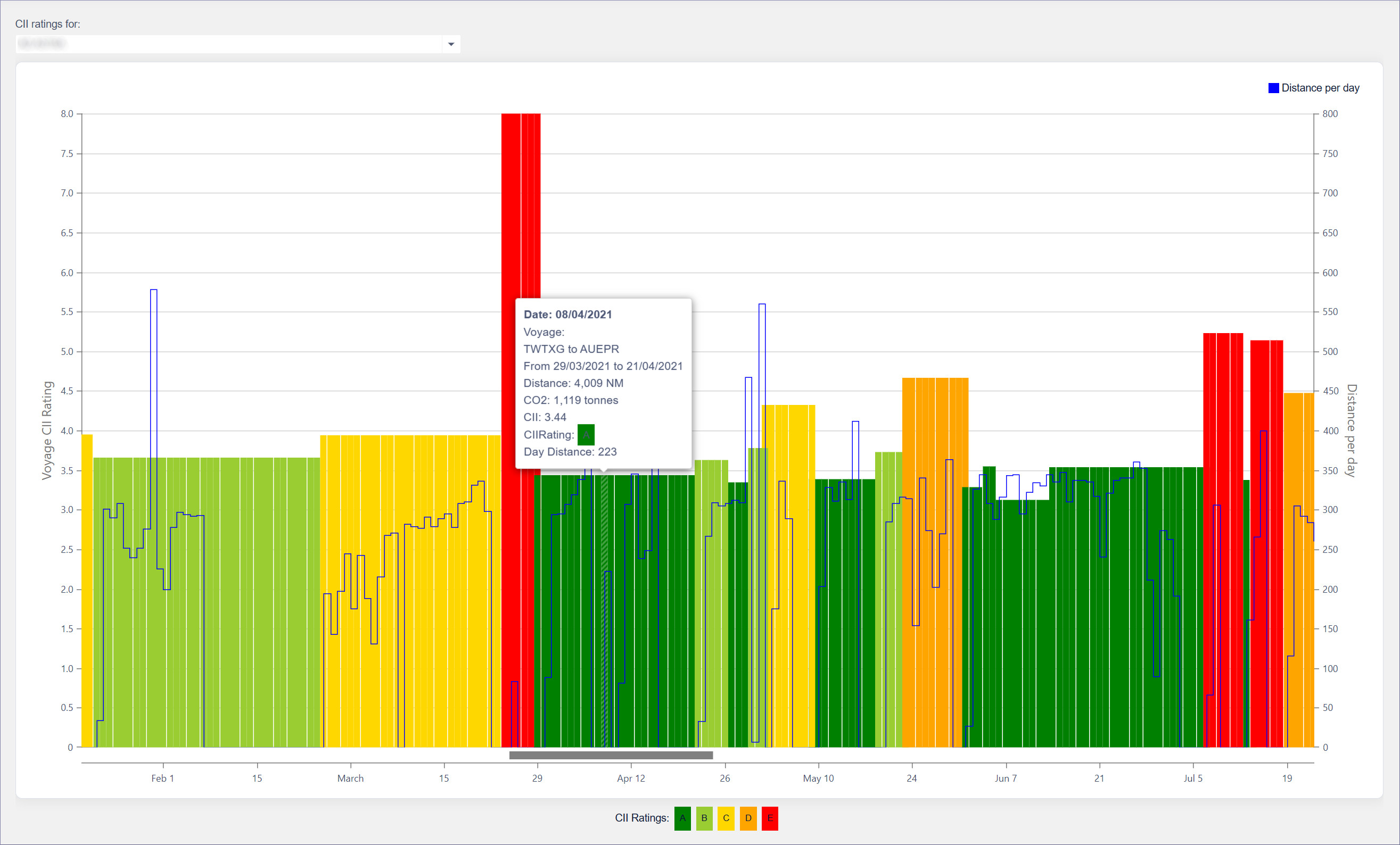 - Vessel Voyage Chart, a graphical representation of the vessels past voyage and their CII rating